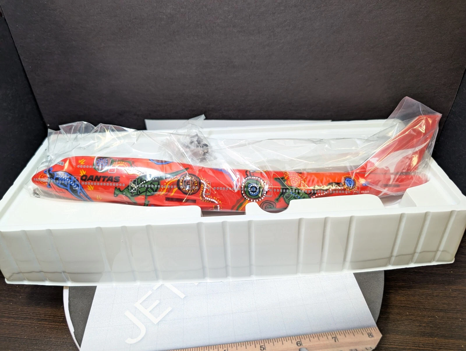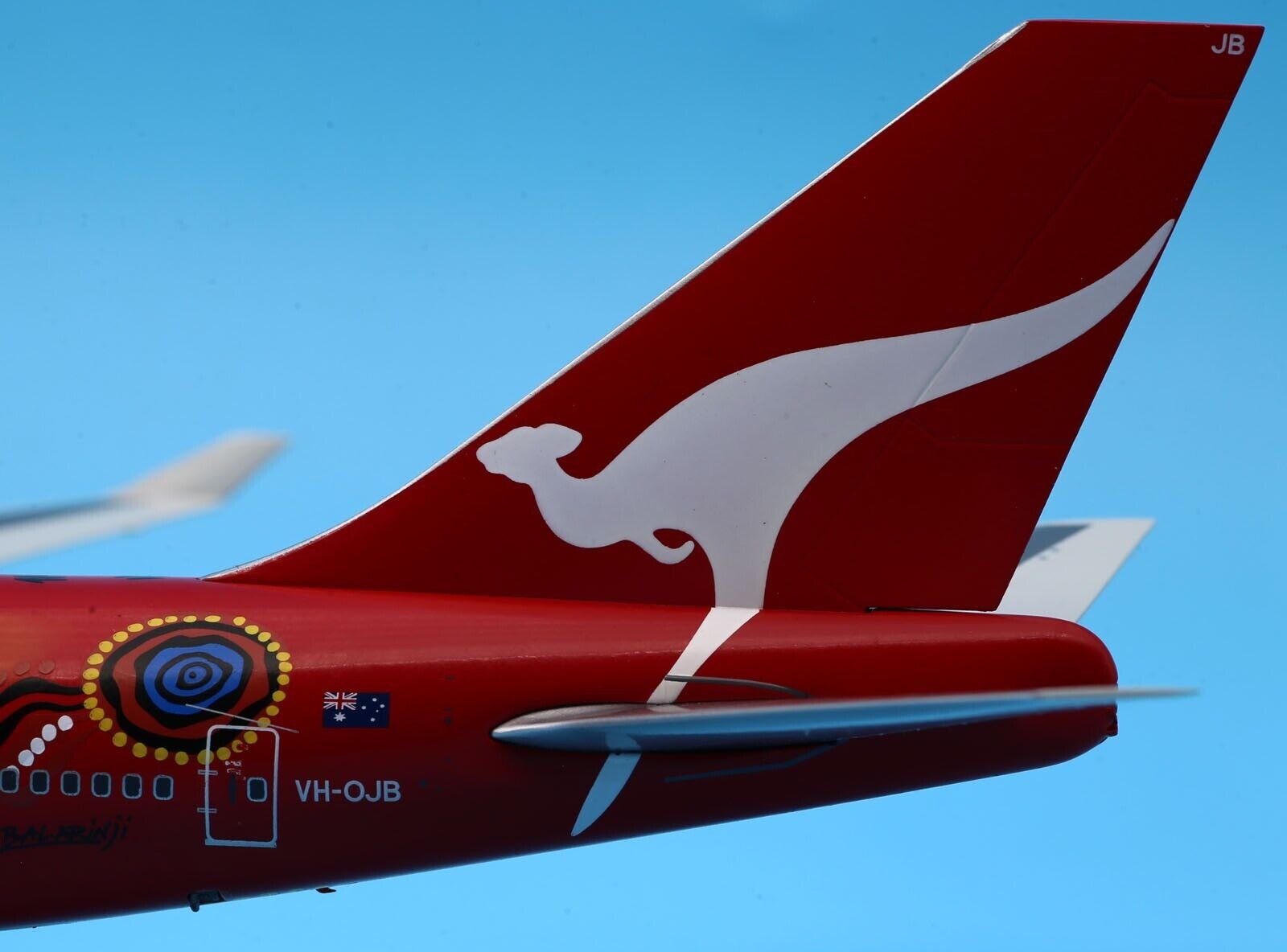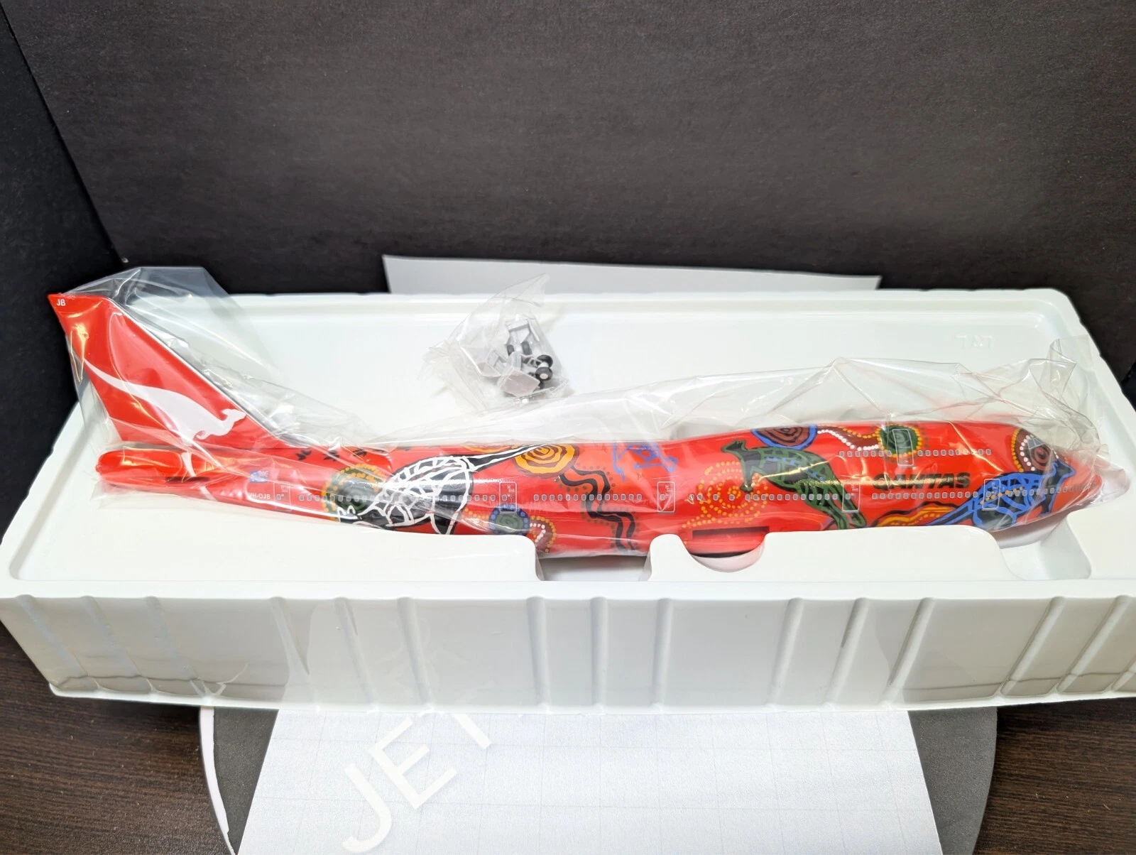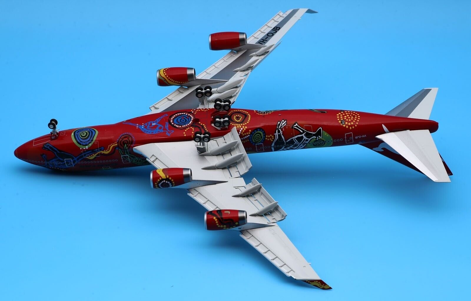 The 1:200 JC Wings Qantas Boeing 747-400 “Wunala Dreaming” (Registration: VH-OJB) is a highly detailed die-cast metal model representing the original “Flying Art” series aircraft.