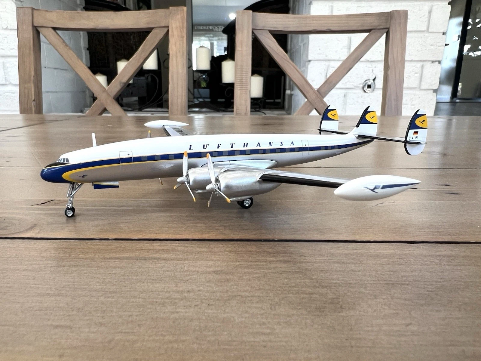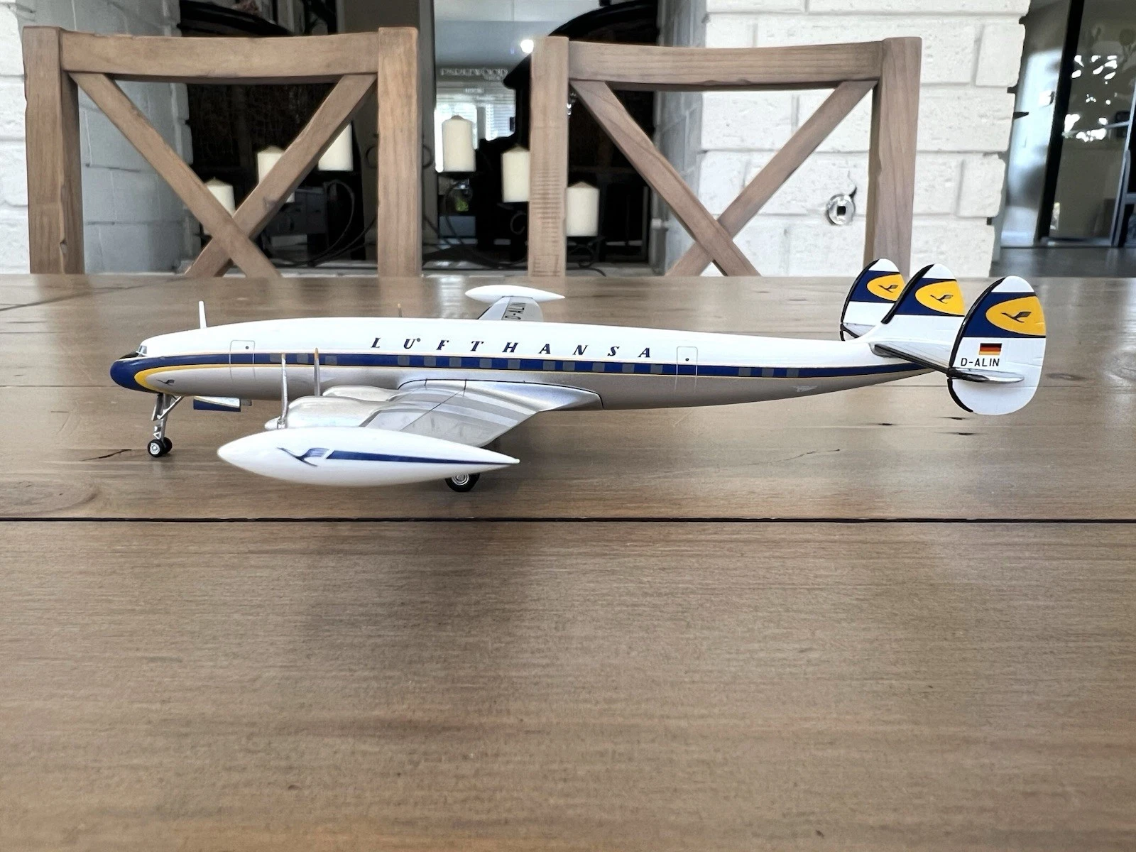 The Herpa 1:200 Lufthansa Lockheed L-1049G Super Constellation with registration D-ALEM (Item #551328) is a highly detailed die-cast metal collector’s model.