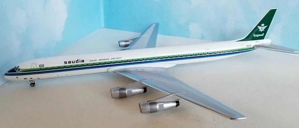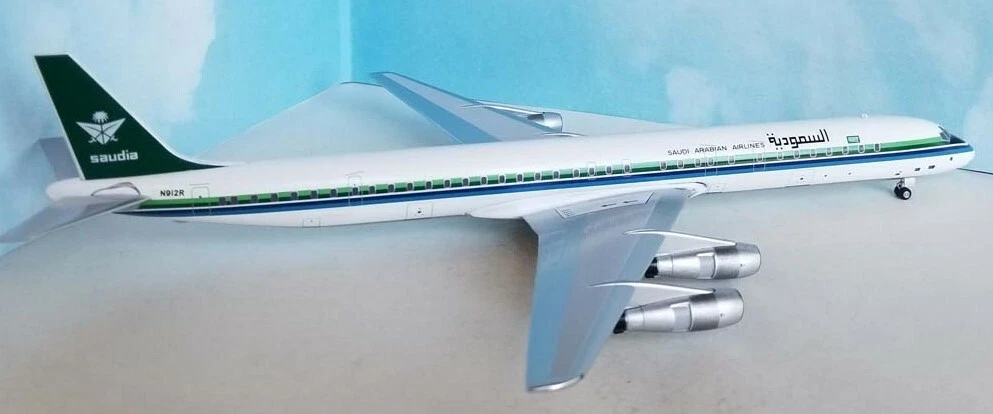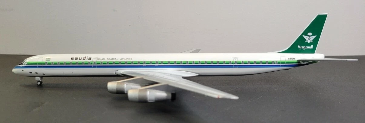The AeroClassics 1:200 Saudia Douglas DC-8-61 (N912R) is a highly detailed die-cast metal model released in 2021. This collectible represents a specific aircraft leased to Saudi Arabian Airlines (Saudia) in the late 1970s and 1980s.
