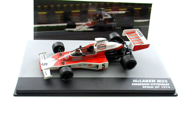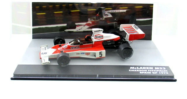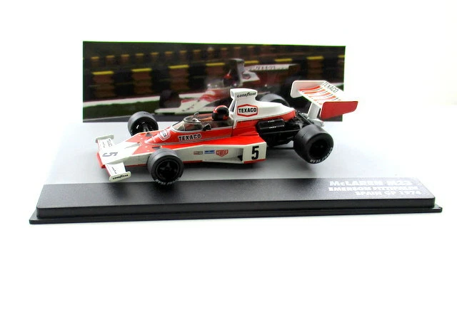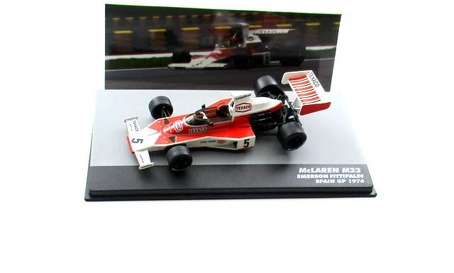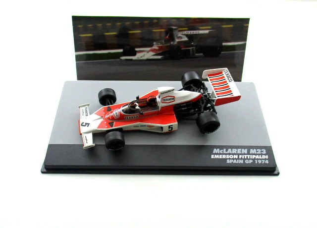 The model accurately reflects the specific car and event, which was a significant race as it marked Niki Lauda’s first F1 victory and Fittipaldi gained valuable points towards his second World Championship title that year. The model is typically new and comes in a plexiglass display case with a base.
