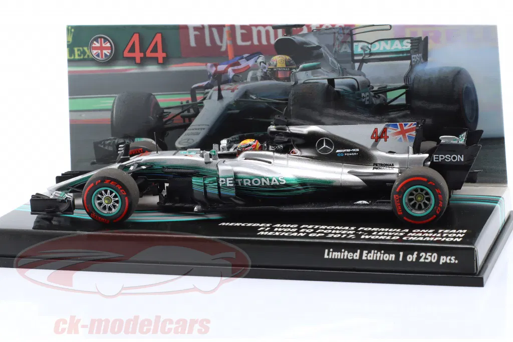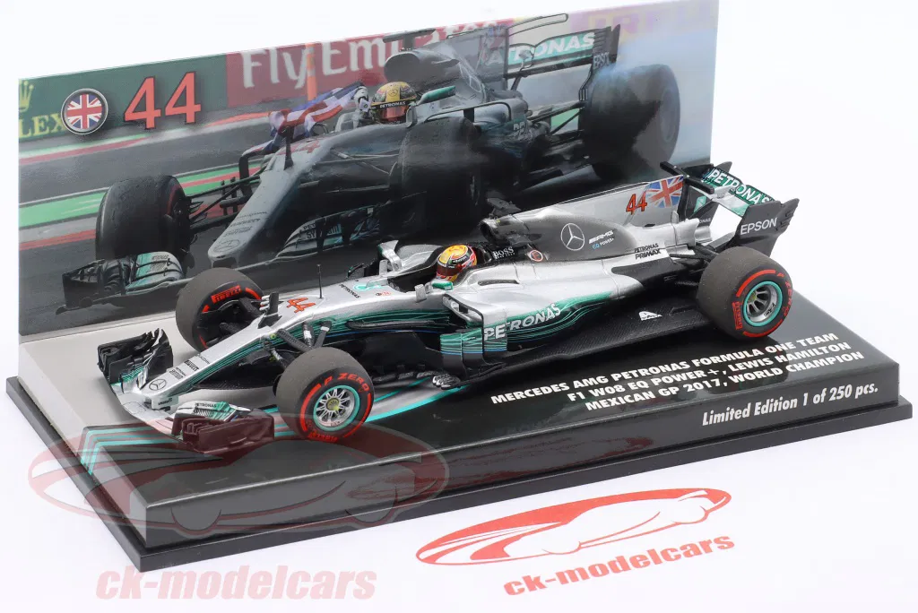 The provided details describe a specific Minichamps model car, the Lewis Hamilton Mercedes W08 EQ Power+ #44 from the 2017 Mexican GP, which is a 1/43 scale replica marking his World Champion title. The model has the article ID 410171844.