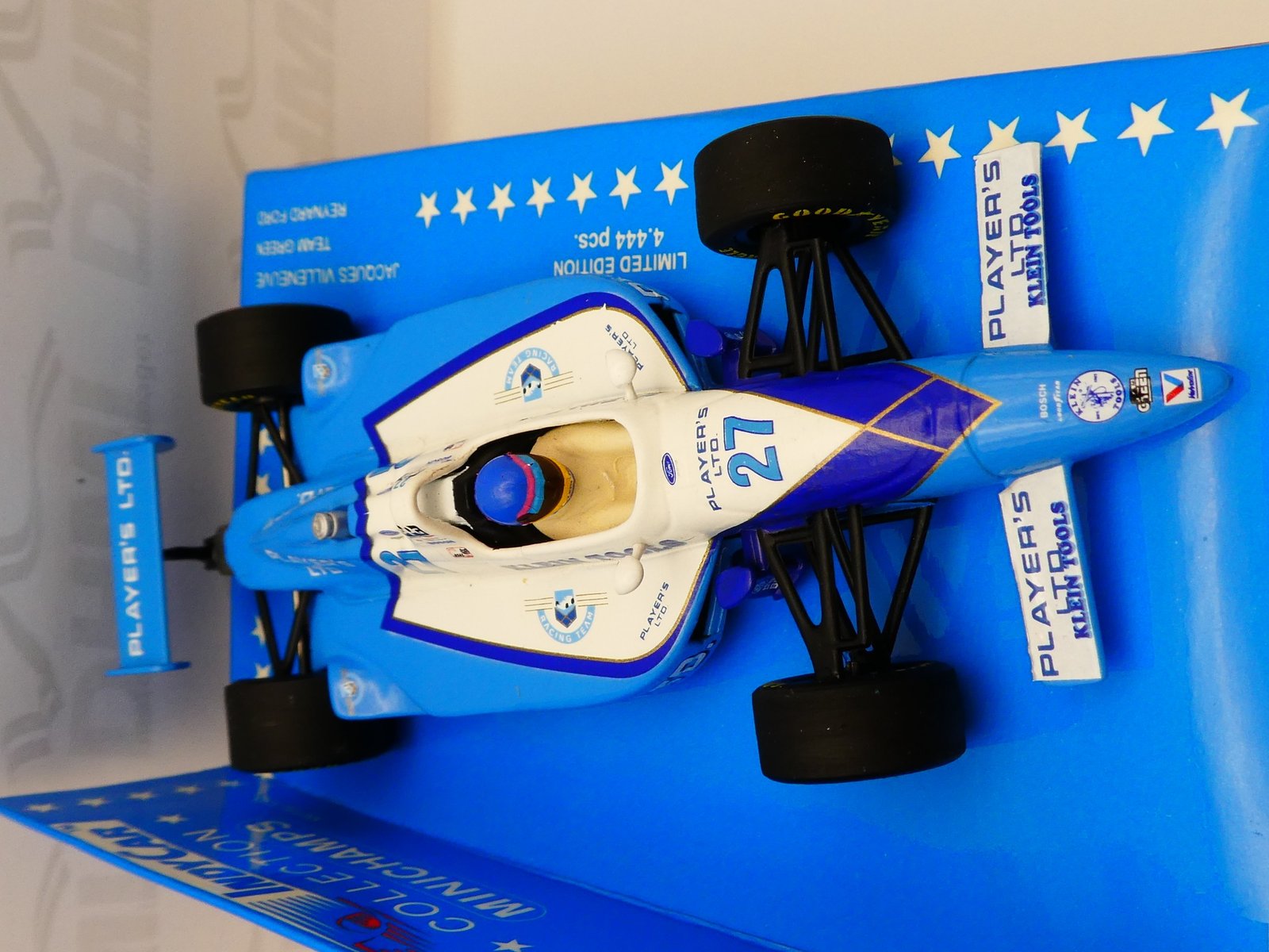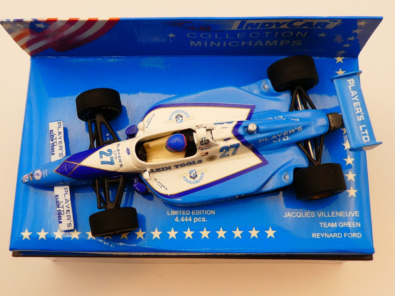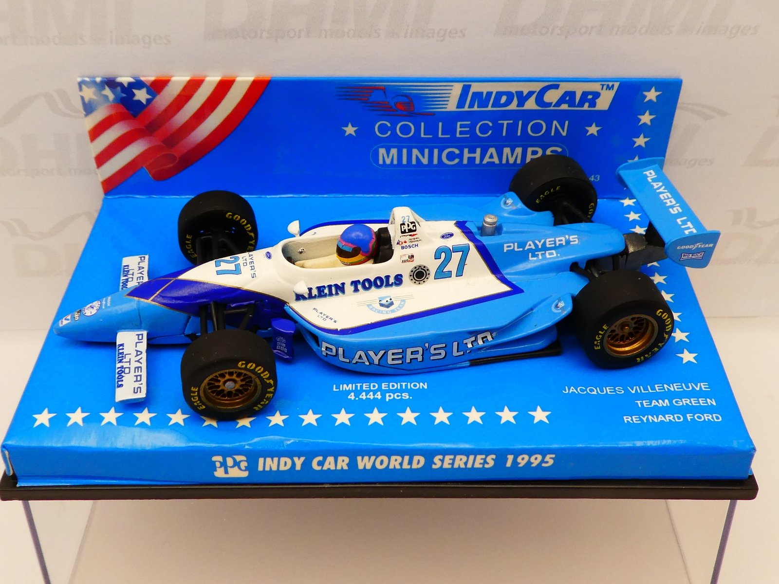 The Minichamps 520954427 1/43 scale model of Jacques Villeneuve’s 1995 Reynard Ford Indy car is an out-of-production collectible and can typically be found for purchase on online auction sites or from specialist diecast model retailers.