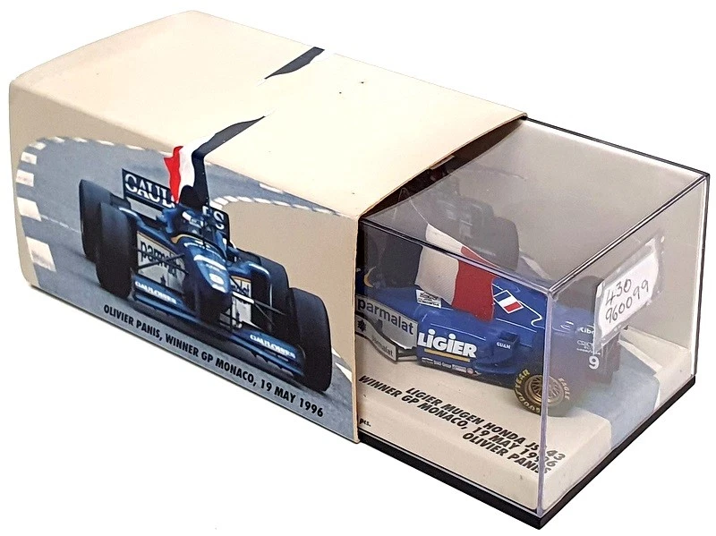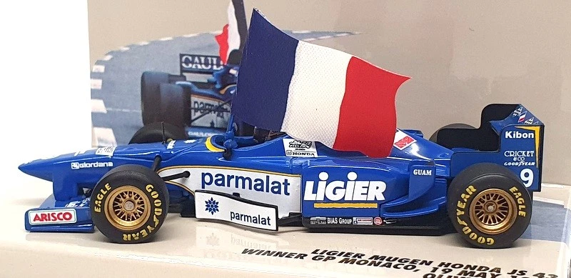 The Minichamps model of the Olivier Panis Ligier Mugen Honda JS43 from the 1996 Monaco GP is a sought-after collector’s item due to the historical significance of the race. Panis’s victory was the last for the Ligier team and the only Grand Prix win of his career, with only three cars finishing the race.