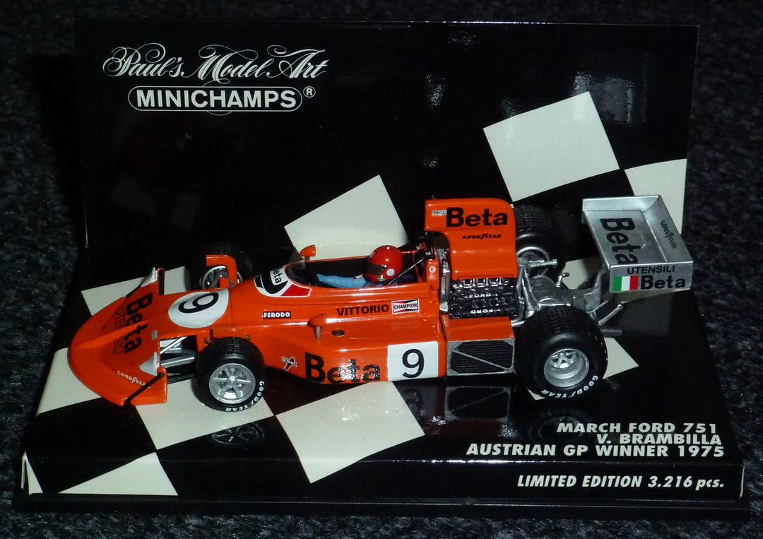 The 1975 Austrian Grand Prix, held on August 17, 1975, at the Österreichring circuit, was a rain-shortened race where only half points were awarded. Brambilla, nicknamed “the Monza Gorilla,” mastered the wet conditions to secure his only Formula 1 victory. Famously, in his excitement, he waved his arms in triumph after crossing the finish line and promptly crashed into the barriers, damaging the front end of his car, but still completed his victory lap.