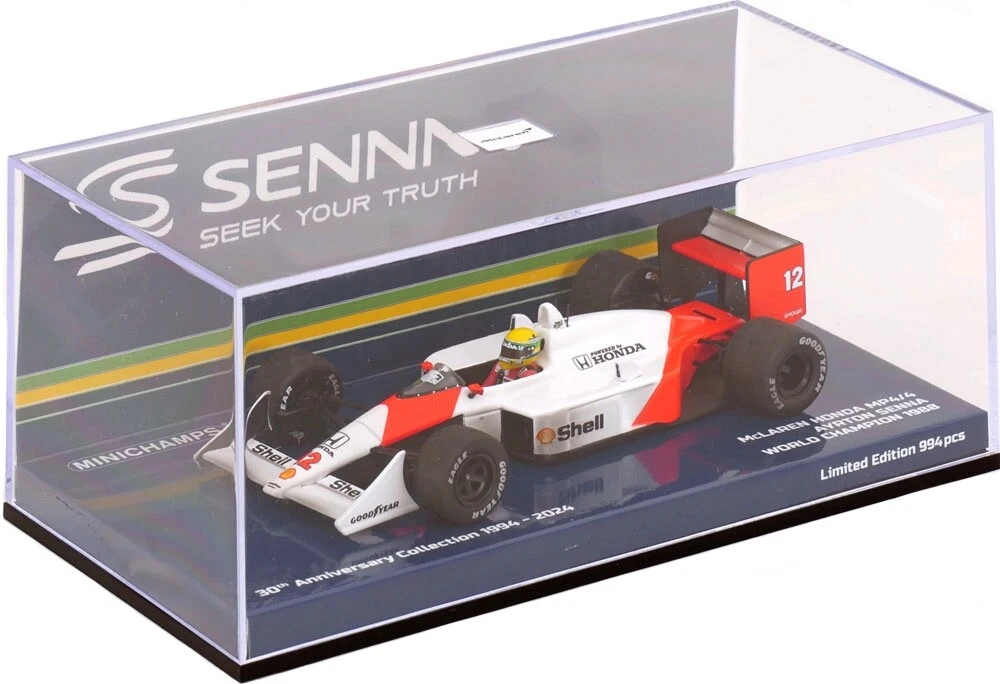 The Minichamps 402888901 is a limited edition 1:43 scale two-car set featuring the 1988 McLaren Honda MP4/4 driven by Ayrton Senna and the 1989 McLaren Honda MP4/5 driven by Alain Prost. Both drivers won the World Championship in their respective seasons with these cars.