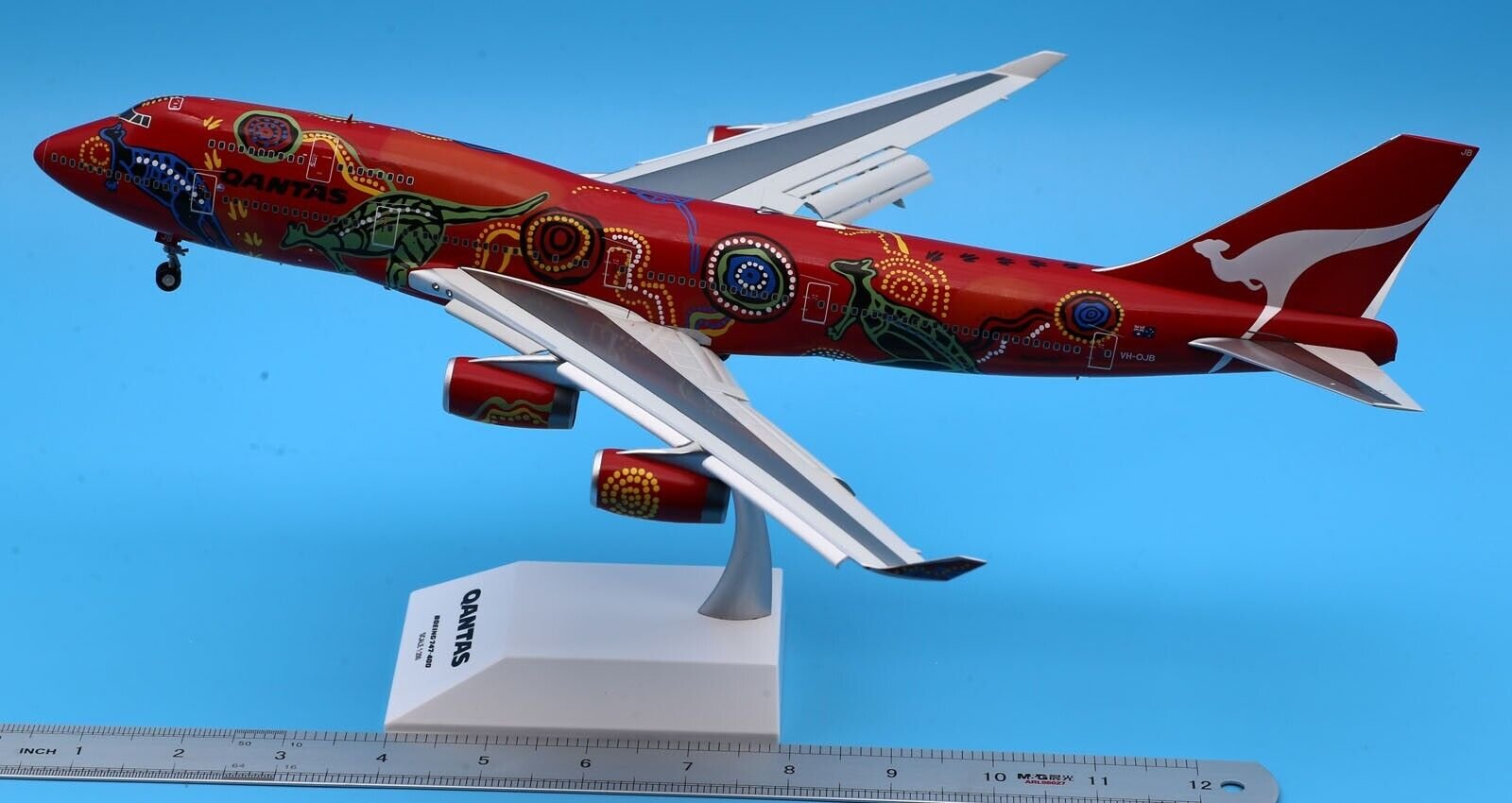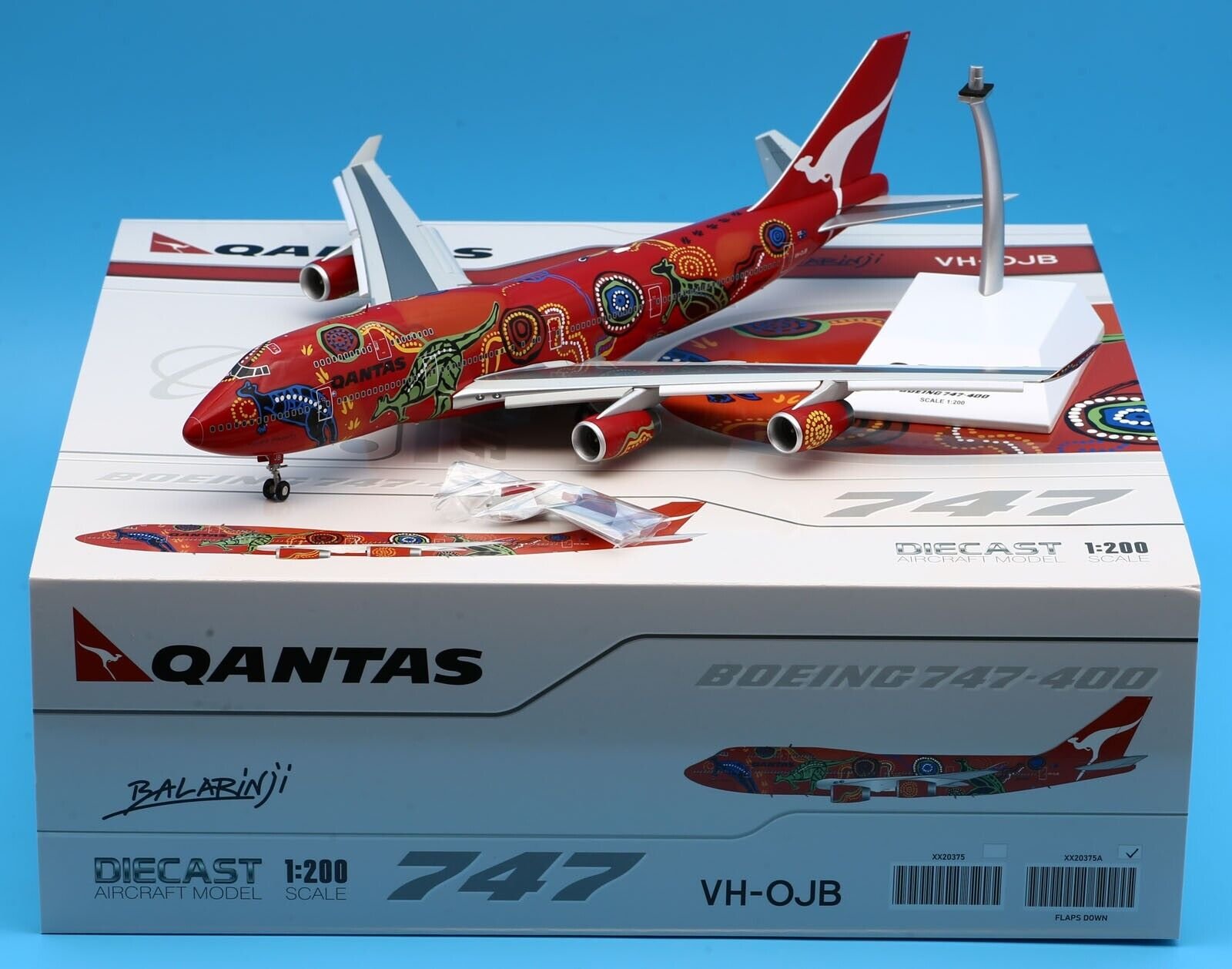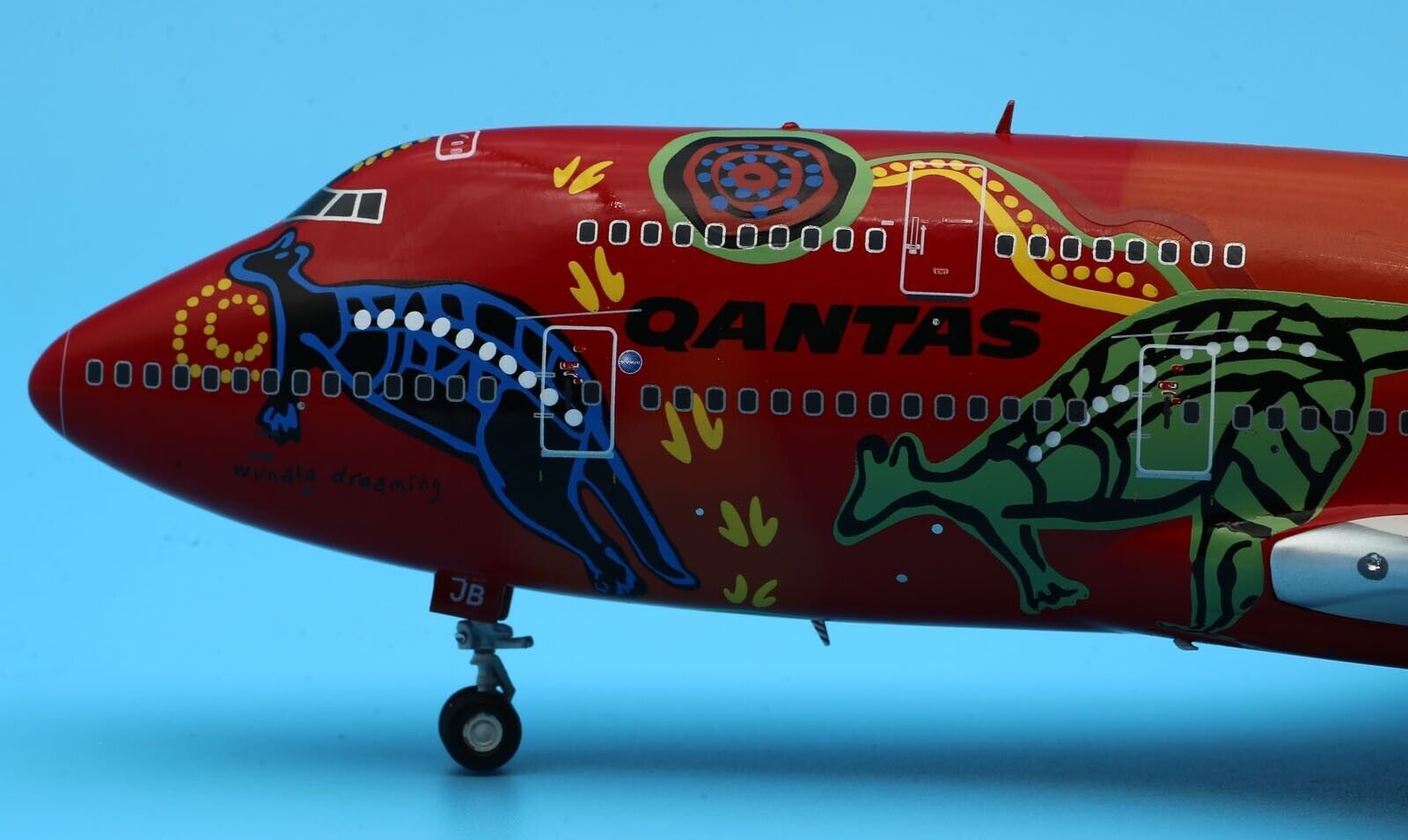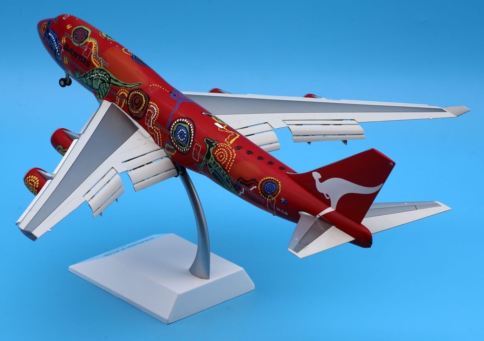 The 1:200 JC Wings Qantas Boeing 747-400 “Wunala Dreaming” (VH-OJB) is a highly detailed diecast model available in multiple configurations.