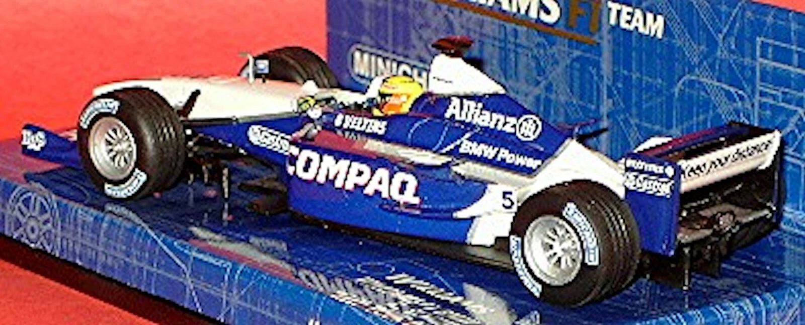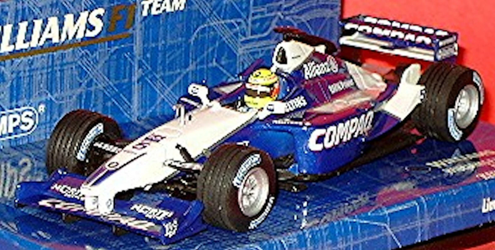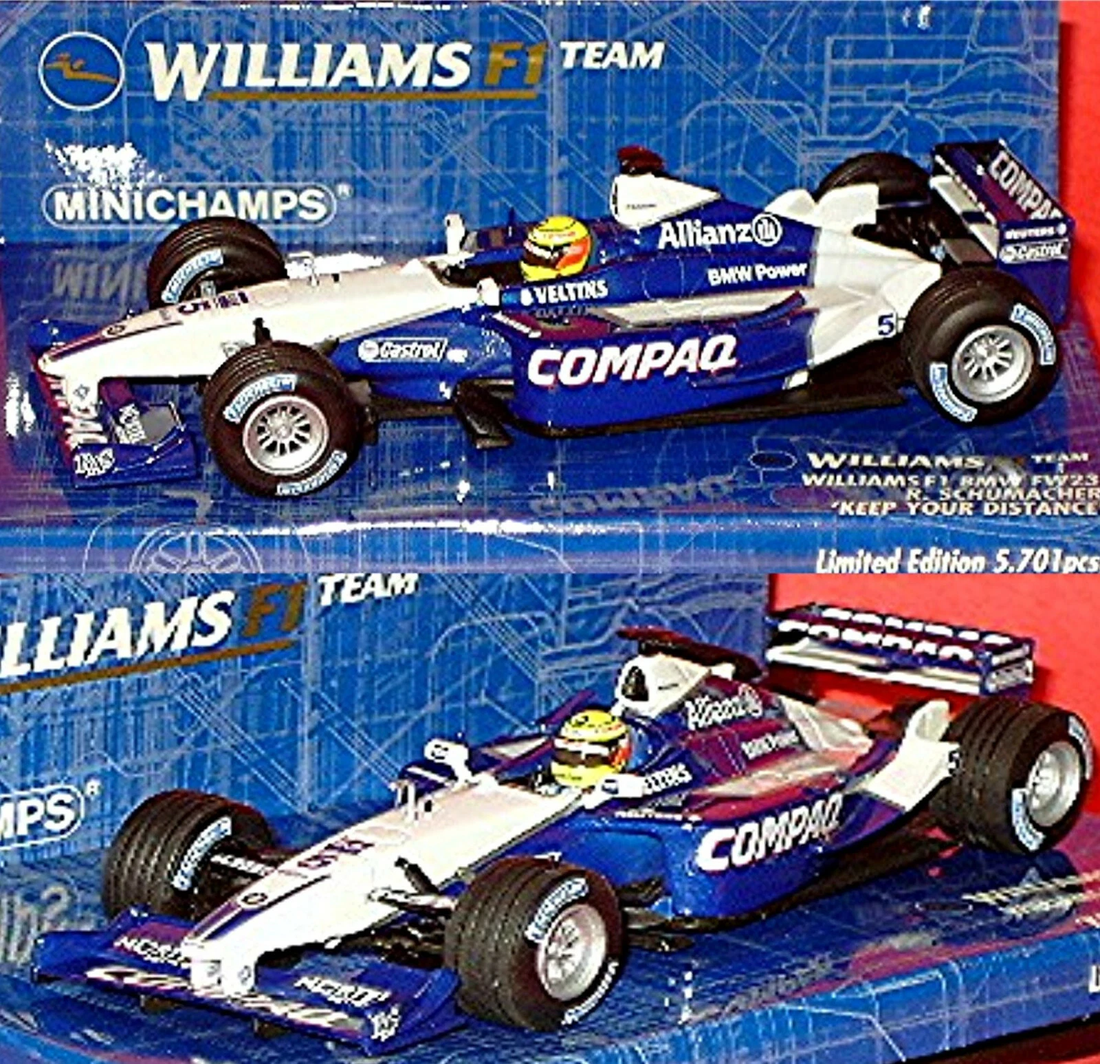 The Minichamps 400010125 is a 1/43 scale diecast model of the Williams BMW FW23, driven by Ralf Schumacher during the 2001 Formula 1 season. This specific version is known as the “Keep your distance” edition, referring to the message displayed on the rear wing of the car during the 1st practice of the San Marino GP.