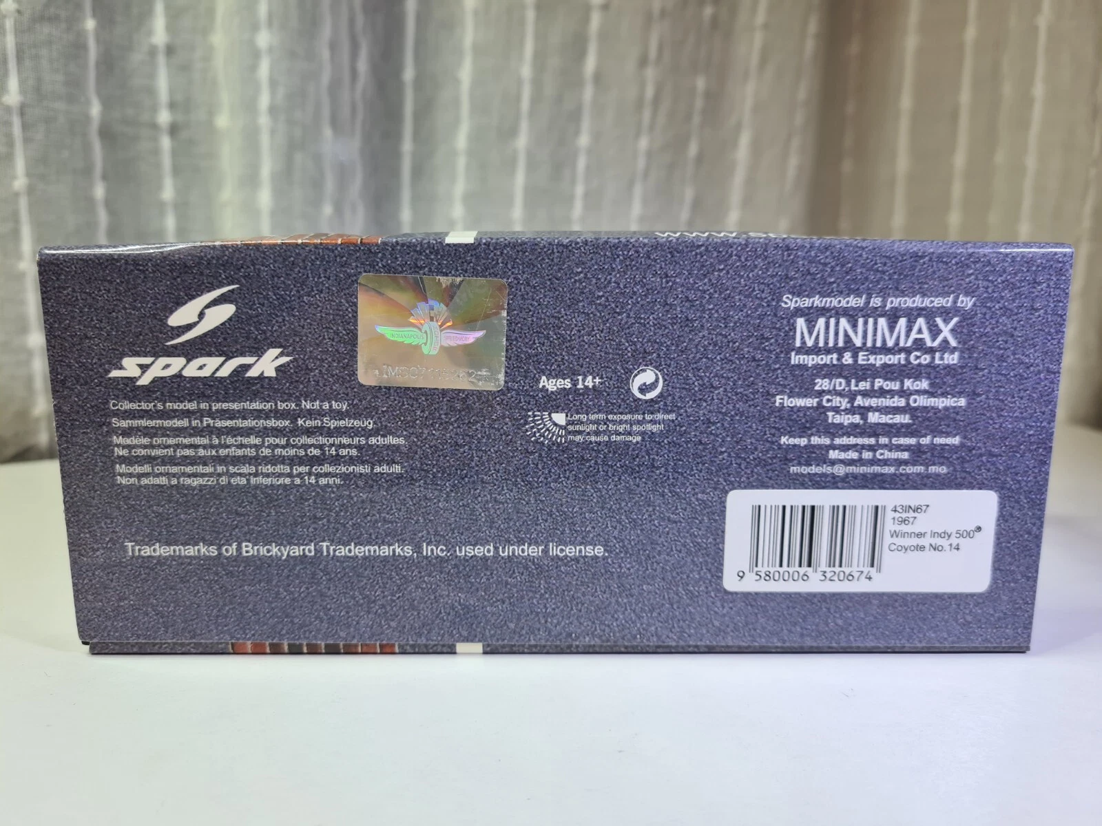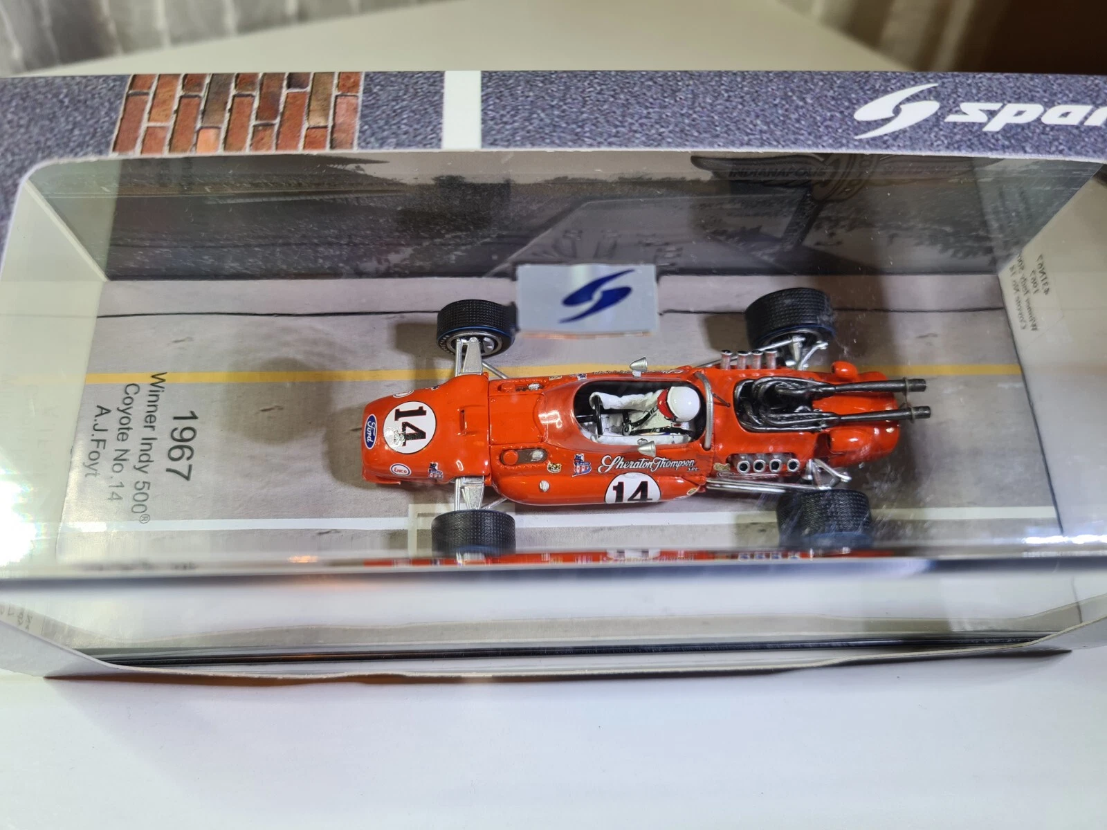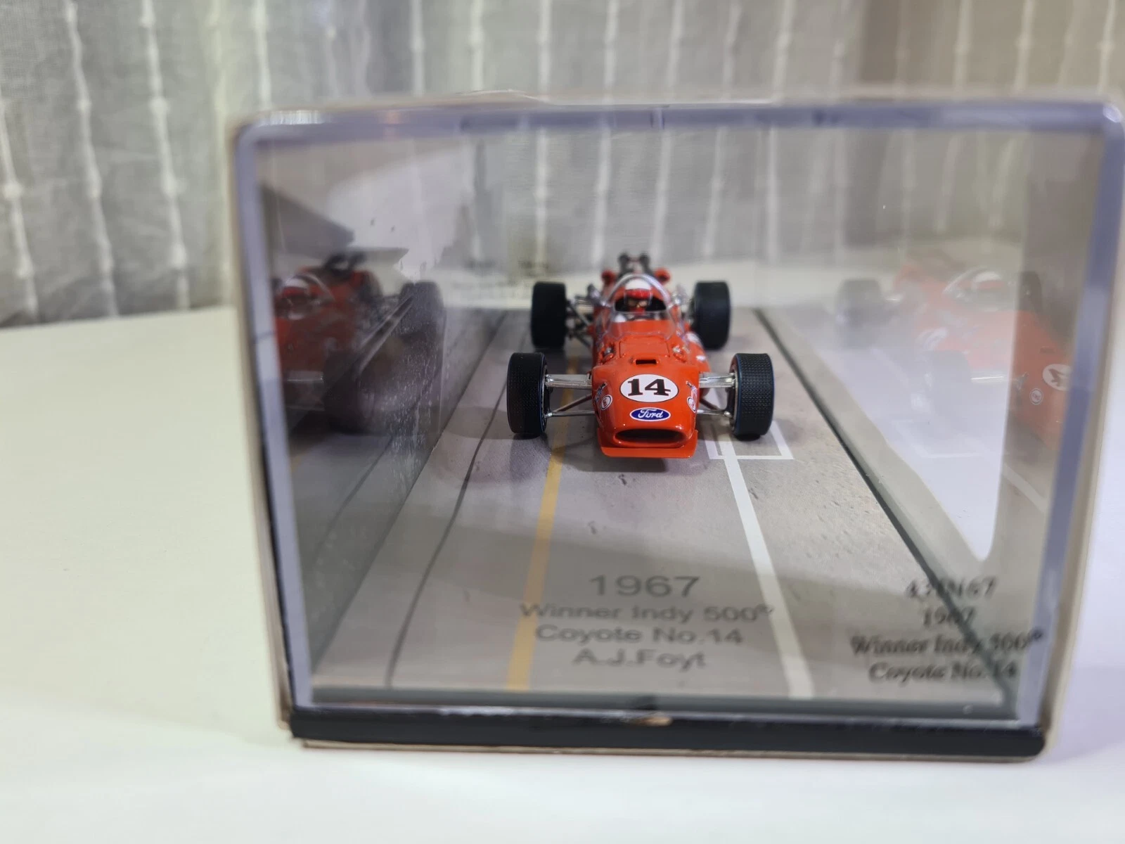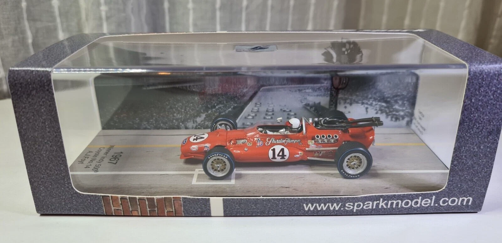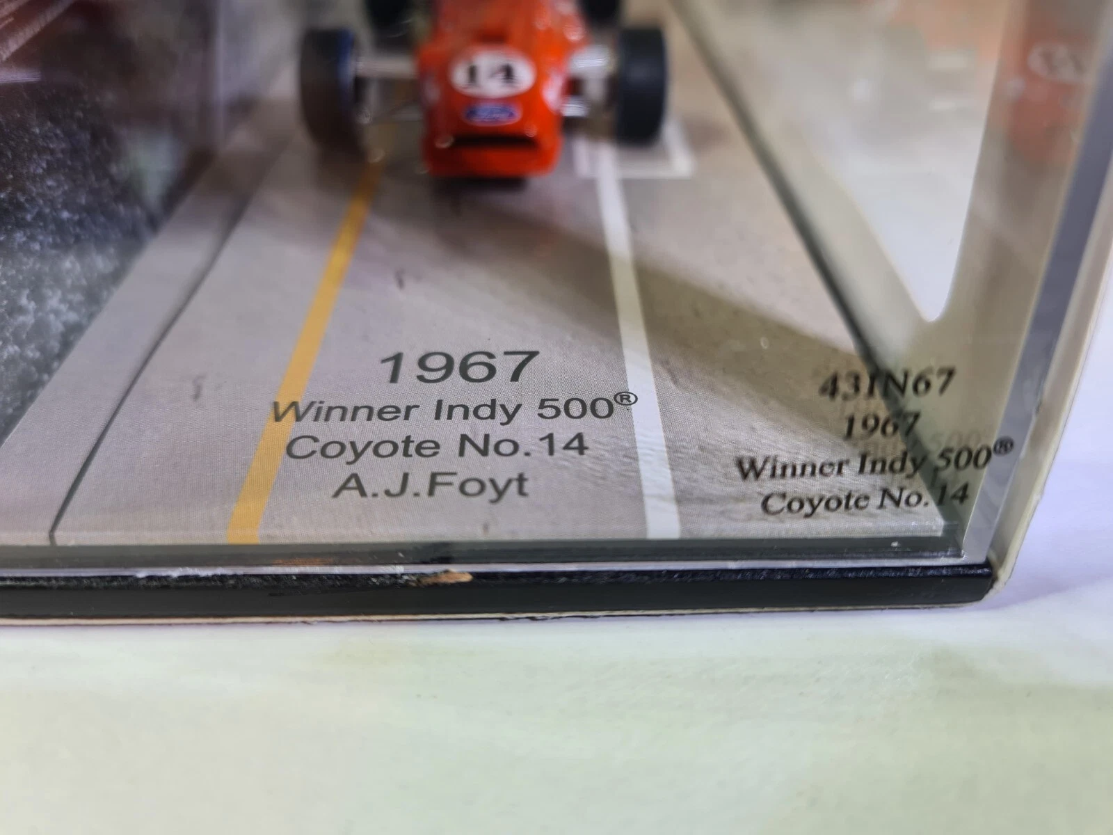 This model represents the Coyote #14, the car A.J. Foyt drove to victory in the 1967 Indianapolis 500. Produced by Spark, this 1/43 scale replica (Part Number 43IN67) is a highly detailed resin collector’s item.