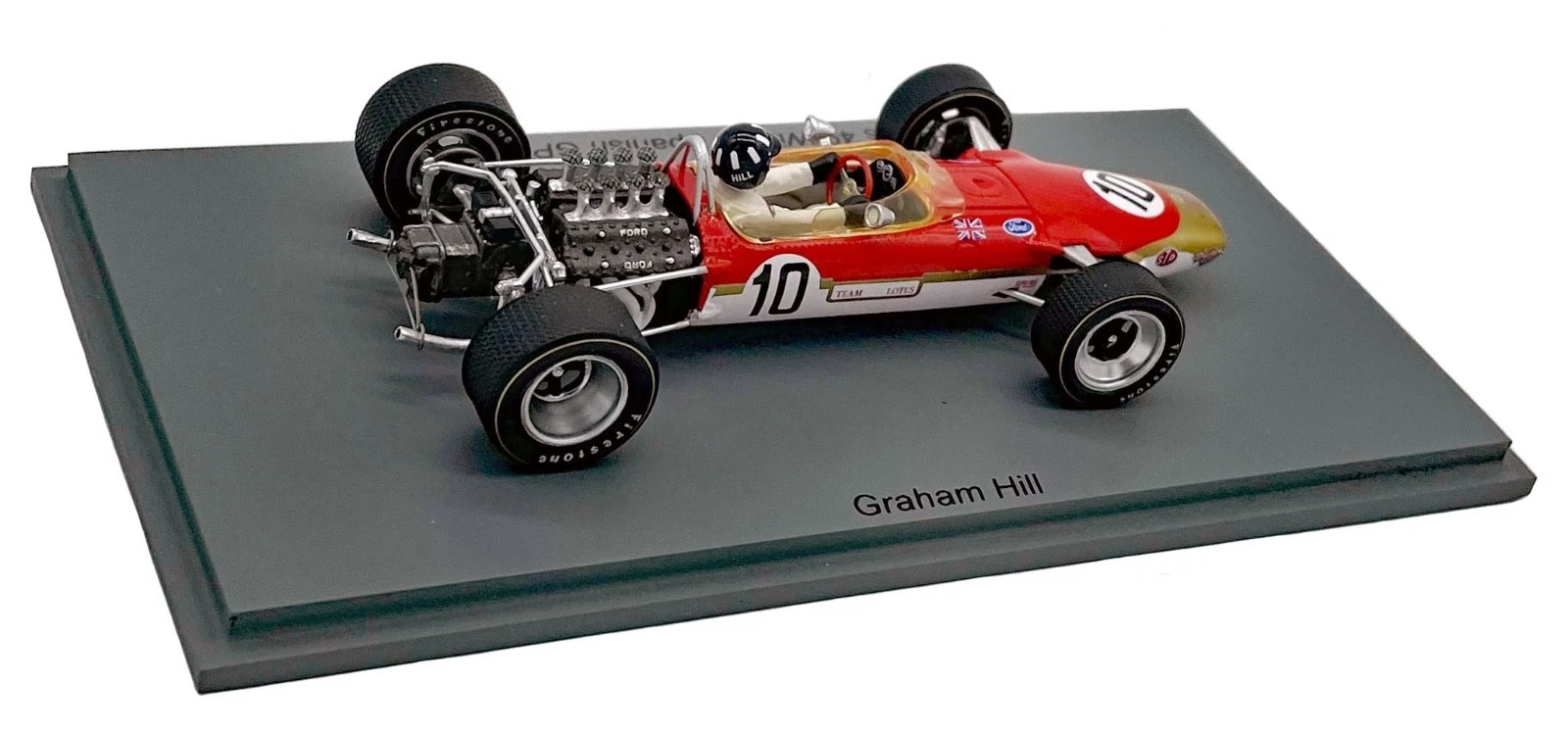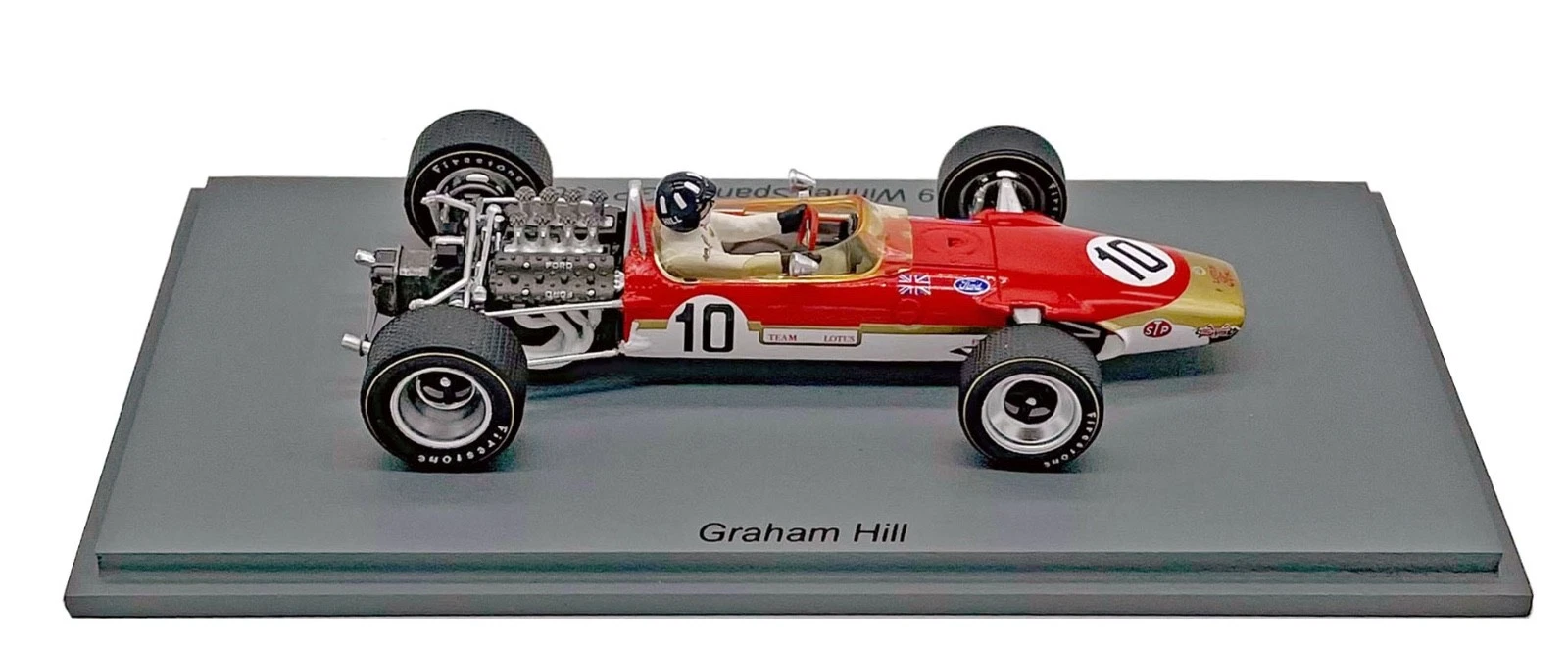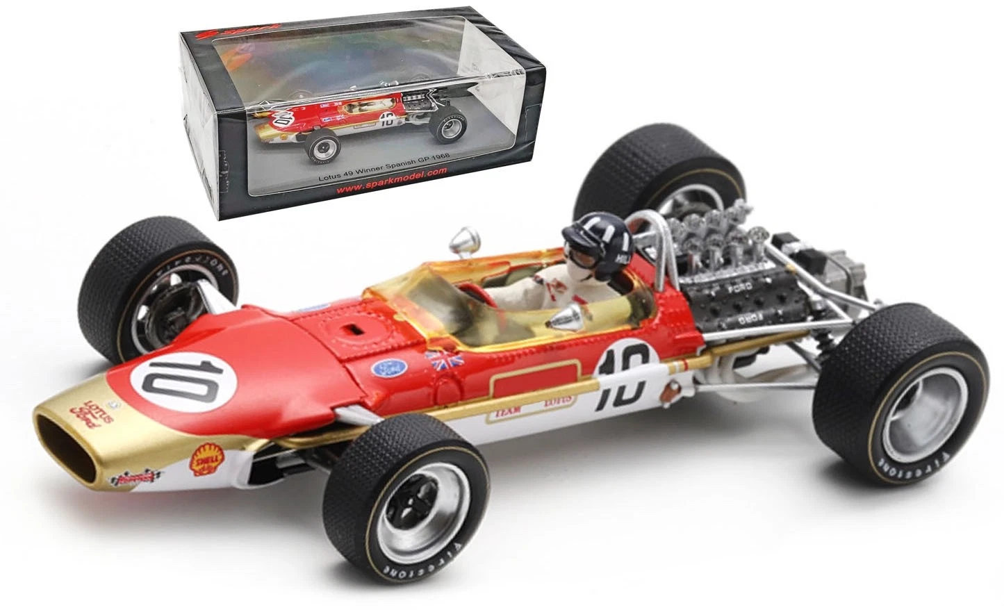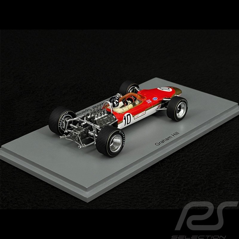 The model in question is a Spark 1:43 scale resin model of the Lotus 49 #10 driven by Graham Hill to victory in the 1968 Spanish Grand Prix. The model is identified by the product code S4829.